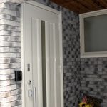 ドア廻りはシックな色のレンガ張り